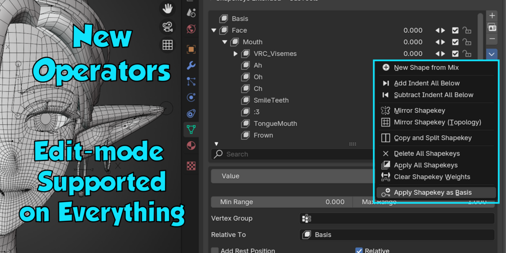 Shapekeys Extended is a full overhaul of the shapekey system in Blender with new features and improvements. It hosts all of the same important features with added functionality, quality of life improvements, and additional features - a comprehensive list of all the features can be found below